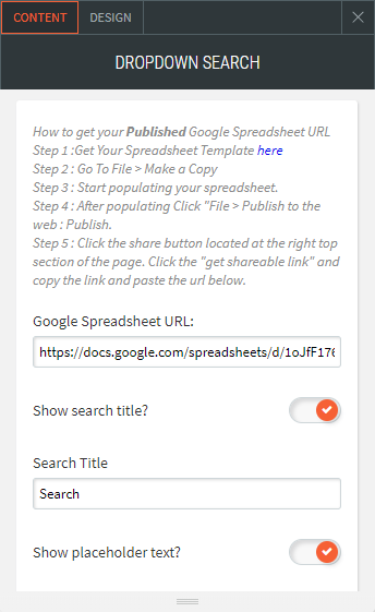 A quick result as you type widget that gives information from products in your spreadsheet. This helps your users to power-up searching of your products by showing a small portion of texts and an image below the search drop down element.