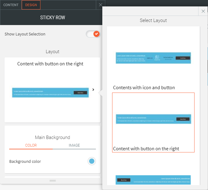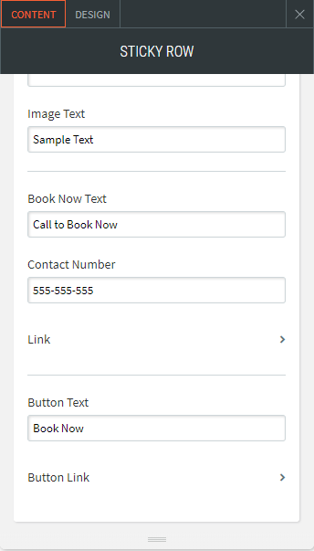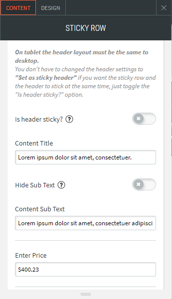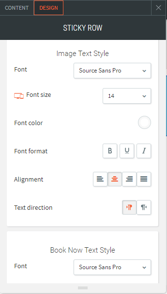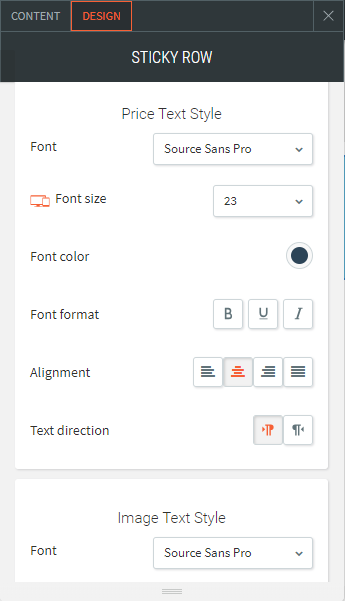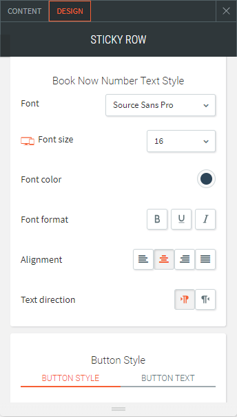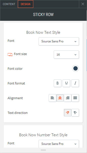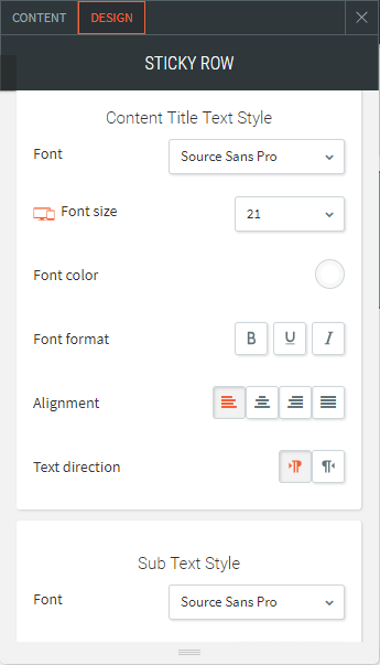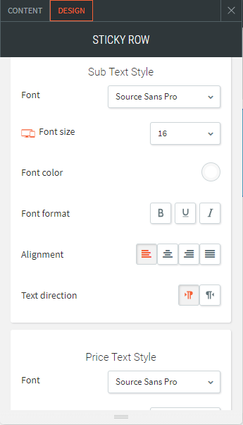 - Modify the font style, color, size and text alignment of the Sticky row titles, sub text and button text.